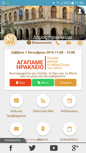 Στην εφαρμογή για κινητές συσκευές (Android & iOS) «Δημότης Ηρακλείου» που έχει δημιουργήσει ο Δήμος Ηρακλείου και μέσω της οποίας μπορούν οι πολίτες να δηλώνουν κάθε πρόβλημα, να ενημερώνονται για τα νέα, τις εκδηλώσεις και τις διακηρύξεις του Δήμου, βρίσκεται πλέον και η δράση του Σαββάτου 1ης Οκτωβρίου 2016 «ΑΓΑΠΑΜΕ ΗΡΑΚΛΕΙΟ».