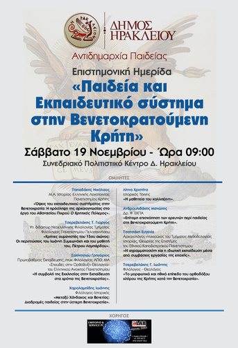 Ημερίδα με θέμα «Παιδεία και Εκπαιδευτικό σύστημα στην Βενετοκρατούμενη Κρήτη» διοργανώνει το Σάββατο 19 Νοεμβρίου 2016 και ώρα 09:00 η Αντιδημαρχία Παιδείας του Δήμου Ηρακλείου στο Πολιτιστικό Συνεδριακό Κέντρο.