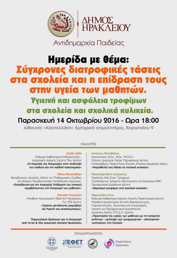 Ημερίδα με θέμα τις σύγχρονες διατροφικές τάσεις στα σχολεία και η επίδραση τους στην υγεία των μαθητών διοργανώνει αύριο Παρασκευή 14 Οκτωβρίου ο Δήμος Ηρακλείου (Αντιδημαρχία Παιδείας) σε συνεργασία με την Διεύθυνση Δημόσιας Υγείας και Κοινωνικής Μέριμνας της Π.Ε Ηρακλείου, τον ΕΦΕΤ, το Επιμελητήριο και το Σύλλογο Μισθωτών Σχολικών Κυλικείων Σχολικών κτιρίων.