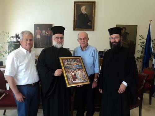 Ευχαριστήρια επιστολή του Αρχιεπισκόπου Κρήτης κ. Ειρηναίου και αναμνηστικά δώρα από την Αγία και Μεγάλη Σύνοδο της Ορθοδοξίας που πραγματοποιήθηκε στην Κρήτη, παρέδωσαν χθες, Πέμπτη 21 Ιουλίου 2016, στο Δήμαρχο Ηρακλείου κ. Βασίλη Λαμπρινό, ο Πρωτοσύγκελος της Ιεράς Αρχιεπισκοπής κ. Μεθόδιος Βερνιδάκης και ο Γενικός Αρχιερατικός Επίτροπος Αρχιμανδρίτης κ. Πρόδρομος Ξενάκης, παρουσία του Δημάρχου Μαλεβιζίου κ. Κώστα Μαμουλάκη.