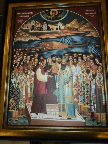 Μεταξύ των αναμνηστικών περιλαμβάνεται και η εικόνα που αναπαριστά την παράδοση της Τίμιας Κάρας του Αγίου Τίτου, πρώτου Επισκόπου Κρήτης από την Καθολική εκκλησία προς τον Μακαριστό Αρχιεπίσκοπο Ευγένιο, με την συμπλήρωση 50 ετών από το σημαντικό αυτό γεγονός για την Κρήτη. Η συγκεκριμένη παράσταση βρίσκεται εντός του Παρεκκλησίου του Αγίου Ανδρέα της Ιεράς Αρχιεπισκοπής και η οποία είναι έργο του γνωστού Κρητικού ζωγράφου Δημητρίου Σαριδάκη.