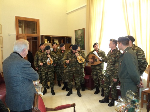«Αρχιμηνιά κι Αρχιχρονιά» με λύρα και λαούτο και άλλα παραδοσιακά Κρητικά κάλαντα, έψαλλαν στο Δήμαρχο Ηρακλείου κ.Βασίλη Λαμπρινό παρουσία και της Δόκιμοι έφεδροι αξιωματικοί (ΔΕΑ) και οπλίτες της ΣΕΑΠ και οι σμηνίτες από την 133 Σμηναρχία Μάχης του Καστελίου Πεδιάδος.