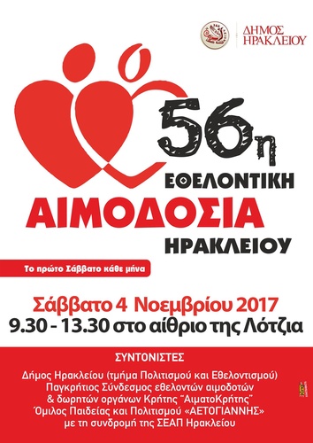 Εθελοντική Αιμοδοσία θα πραγματοποιηθεί το Σάββατο 04.11.2017 στο κέντρο της πόλης του Ηρακλείου (στο Αίθριο της Λότζια), και ώρες 10:00 – 13:30. Πρόκειται για μια κοινή προσπάθεια αιμοδοσίας εθελοντικών σωματείων και οργανώσεων του Ηρακλείου, την οποία συντονίζουν: