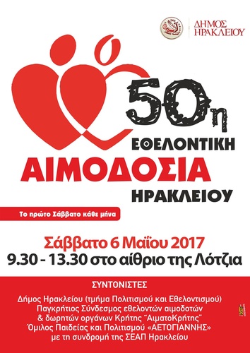 Εθελοντική Αιμοδοσία θα πραγματοποιηθεί το Σάββατο 06.05.2017 στο κέντρο της πόλης του Ηρακλείου (στο Αίθριο της Λότζια), και ώρες 10:00 – 13:30. Πρόκειται για μια κοινή προσπάθεια αιμοδοσίας εθελοντικών σωματείων και οργανώσεων του Ηρακλείου, την οποία συντονίζουν: