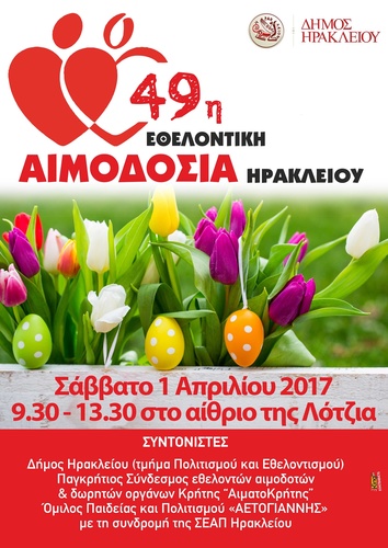 Εθελοντική Αιμοδοσία θα πραγματοποιηθεί το Σάββατο 01.04.2017 στο κέντρο της πόλης του Ηρακλείου, (στο Αίθριο της Λότζια) και ώρες 10:00 – 13:30. Πρόκειται για μια κοινή προσπάθεια αιμοδοσίας εθελοντικών σωματείων και οργανώσεων του Ηρακλείου, την οποία συντονίζουν: