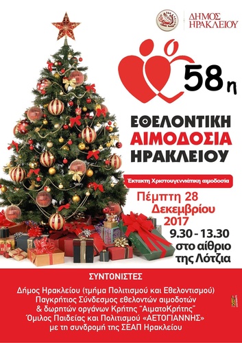 Έκτακτη Χριστουγεννιάτικη Εθελοντική Αιμοδοσία θα πραγματοποιηθεί την Πέμπτη 28.12.2017 στο κέντρο της πόλης του Ηρακλείου (στο Αίθριο της Λότζια),  και ώρες  10:00 – 13:30.  Πρόκειται για μια κοινή προσπάθεια αιμοδοσίας εθελοντικών σωματείων και οργανώσεων του Ηρακλείου, την οποία συντονίζουν: