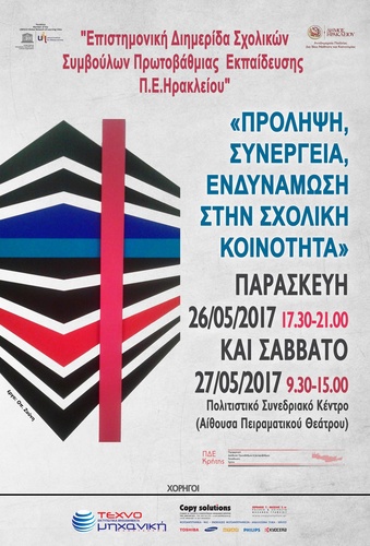Η Αντιδημαρχία Παιδείας, Δια Βίου Μάθησης και Καινοτομίας του Δήμου Ηρακλείου , το Τμήμα Επιστημονικής και Παιδαγωγικής Καθοδήγησης Α/θμιας Εκπαίδευσης Κρήτης και οι Σχολικοί Σύμβουλοι Πρωτοβάθμιας Εκπαίδευσης Περιφερειακής Ενότητας Ηρακλείου διοργανώνουν Επιστημονική Διημερίδα με θέμα «Πρόληψη, Συνέργεια, Ενδυνάμωση της σχολικής κοινότητας».