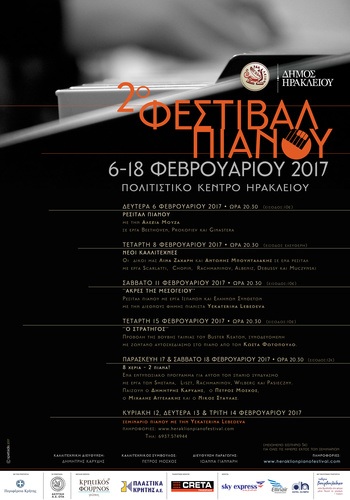 12-14 Φεβρουαρίου: Σεμινάριο Πιάνου με την καθηγήτρια του Royal College of Music του Λονδίνου Yekaterina Lebedeva. To σεμινάριο θα πραγματοποιηθεί στο Πολιτιστικό Κέντρο και θα είναι ανοιχτό σε μαθητές Κατωτέρας, Μέσης, Ανωτέρας, Πτυχιούχους και Διπλωματούχους. Για περισσότερες πληροφορίες και αιτήσεις συμμετοχής: www.heraklionpianofestival.com/seminario