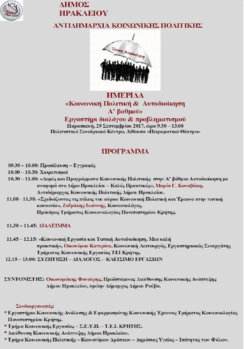 Η Αντιδημαρχία Κοινωνικής Πολιτικής Δήμου Ηρακλείου, η Διεύθυνση Κοινωνικής Ανάπτυξης, το Εργαστήριο Κοινωνικής Ανάλυσης & και Εφαρμοσμένης Κοινωνικής Έρευνας - Τμήμα Κοινωνιολογίας Πανεπιστημίου Κρήτης και το Τμήμα Κοινωνικής Εργασίας – Σ.Ε.Υ.Π. – ΤΕΙ Κρήτης, συνδιοργανώνουν ημερίδα με θέμα «Κοινωνική Πολιτική και Αυτοδιοίκηση Α’ Βαθμού. Εργαστήριο διαλόγου και προβληματισμού».