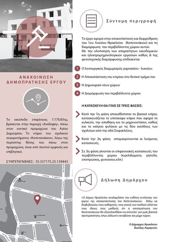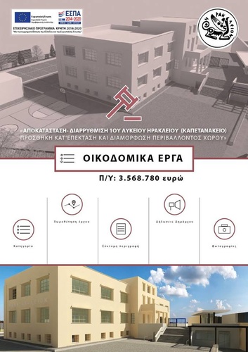 Τελείωσε το πρωί της Τρίτης 7 Φεβρουαρίου 2017 η προθεσμία για την υποβολή προσφορών για το έργο «ΑΠΟΚΑΤΑΣΤΑΣΗ – ΔΙΑΡΡΥΘΜΙΣΗ 1ου ΛΥΚΕΙΟΥ ΗΡΑΚΛΕΙΟΥ "ΚΑΠΕΤΑΝΑΚΕΙΟ" ΠΡΟΣΘΗΚΗ ΚΑΤ΄ ΕΠΕΚΤΑΣΗ ΚΑΙ ΔΙΑΜΟΡΦΩΣΗ ΠΕΡΙΒΑΛΛΟΝΤΟΣ ΧΩΡΟΥ», προϋπολογισμού 3.568.780,49€.
