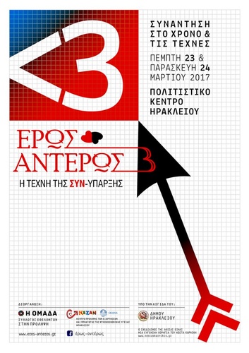 Ο Σύλλογος Εθελοντών στην Πρόληψη «Η Ομάδα» και το ΚΕΣΑΝ – Κέντρο Πρόληψης των Εξαρτήσεων και Προαγωγής της Ψυχοκοινωνικής Υγείας Ηρακλείου σας προσκαλούν στη διημερίδα: «Έρως – Αντέρως: Η Τέχνη της συν – Ύπαρξης», 2017, που θα πραγματοποιηθεί την Πέμπτη 23 και την Παρασκευή 24 Μαρτίου 2017, στο Πολιτιστικό Συνεδριακό Κέντρο Ηρακλείου. Η διημερίδα τελεί υπό την αιγίδα του Δήμου Ηρακλείου.