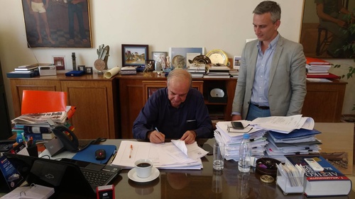 Υπεγράφη σήμερα, Δευτέρα 19 Ιουνίου, στη Λότζια η σύμβαση για την τσιμεντόστρωση αγροτικών δρόμων που βρίσκονται στις δημοτικές ενότητες και δημοτικές κοινότητες του Δήμου Ηρακλείου. Την σύμβαση υπέγραψε ο Δήμαρχος Ηρακλείου Βασίλης Λαμπρινός παρουσία του Αντιδημάρχου Τεχνικών Έργων Γιάννη Αναστασάκη με τον εκπρόσωπο της αναδόχου εταιρίας.