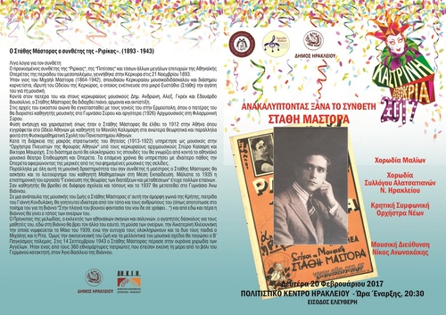 Με ένα αφιέρωμα στον Στάθη Μάστορα με τίτλο «Ανακαλύπτοντας ξανά τον συνθέτη Στάθη Μάστορα - Ελληνικές Οπερέτες», συνεχίζονται οι εκδηλώσεις της «Καστρινής Αποκριάς 2017» που διοργανώνει ο Δήμος Ηρακλείου. Έτσι την Δευτέρα 20 Φεβρουαρίου 2017 στην αίθουσα Πειραματικού Θεάτρου του Πολιτιστικού Συνεδριακού Κέντρου Ηρακλείου θα πραγματοποιηθεί συναυλία στην οποία θα συμμετέχουν η χορωδία Μαλίων, η χορωδία Συλλόγου Αλατσατιανών Νομού Ηρακλείου και η Κρητική Συμφωνική Ορχήστρα Νέων υπό τη μουσική διεύθυνση του Νίκου Αντωνακάκη.