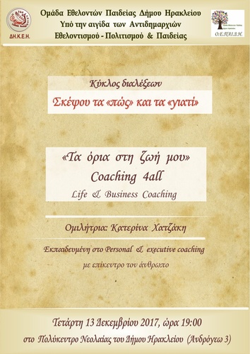 Έτσι την Τετάρτη 13 Δεκεμβρίου 2017 και ώρα 19.00 στο Πολύκεντρο Νεολαίας του Δήμου Ηρακλείου (Ανδρόγεω 3) η Κατερίνα Χατζάκη, Life & Business Coach, μέλος του International Coach Federation (ICF) Global και του ICF Greece, θα μιλήσει για : «Τα όρια στη ζωή μου».