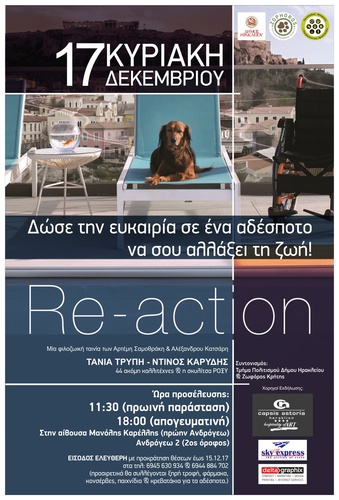 Ο Δήμος Ηρακλείου, στα πλαίσιο της προσπάθειας ευαισθητοποίησης των δημοτών σε θέματα φιλοζωίας, φιλοξενεί την Κυριακή 17 Δεκεμβρίου, στην αίθουσα «Μανόλης Καρέλλης» (Ανδρόγεω 2, 2ος όροφος), την μη κερδοσκοπική, φιλοζωική ταινία «RE – ACTION». Στην προβολή θα παραστούν οι βασικοί συντελεστές της ταινίας (ο σκηνοθέτης Αρτέμης Σαμοθράκης και ο συν-σεναριογράφος Αλέξανδρος Κατσάρης) καθώς και οι ηθοποιοί κ.κ. Άννα Αδριανού και Άννα - Μαρία Κουρή.