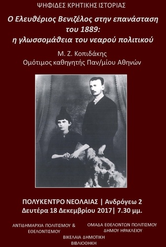 Η Αντιδημαρχία Πολιτισμού και Εθελοντισμού, η Βικελαία Δημοτική Βιβλιοθήκη και η Ομάδα Εθελοντών Πολιτισμού Δήμου Ηρακλείου συνεχίζουν την σειρά παρουσιάσεων θεμάτων κρητικής ιστορίας. Την Δευτέρα 18 Δεκεμβρίου 2017, θα πραγματοποιηθεί ομιλία με θέμα: «Ο Ελευθέριος Βενιζέλος στην επανάσταση του 1889: η γλωσσομάθεια του νέου πολιτικού».