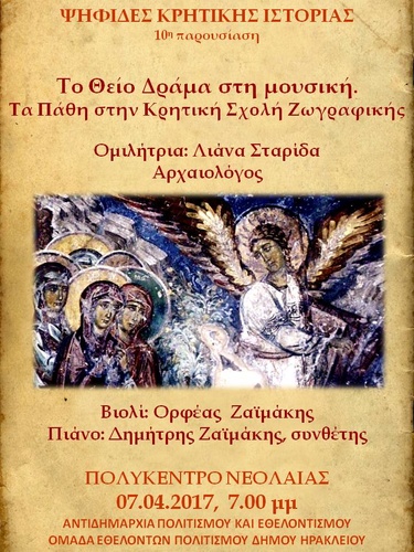 Η Αντιδημαρχία Πολιτισμού και Εθελοντισμού και η Ομάδα Εθελοντών Πολιτισμού Δήμου Ηρακλείου συνεχίζει τη σειρά παρουσιάσεων θεμάτων κρητικής ιστορίας. Η 10η παρουσίαση με ομιλήτρια την αρχαιολόγο κ. Λιάνα Σταρίδα, έχει θέμα: «Το Θείο Δράμα στη μουσική. Τα Πάθη στην Κρητική Σχολή Ζωγραφικής». Η εκδήλωση θα πραγματοποιηθεί στο Πολύκεντρο Νεολαίας, Ανδρόγεω 2, την Παρασκευή 07.04.2017 και ώρα 19:00