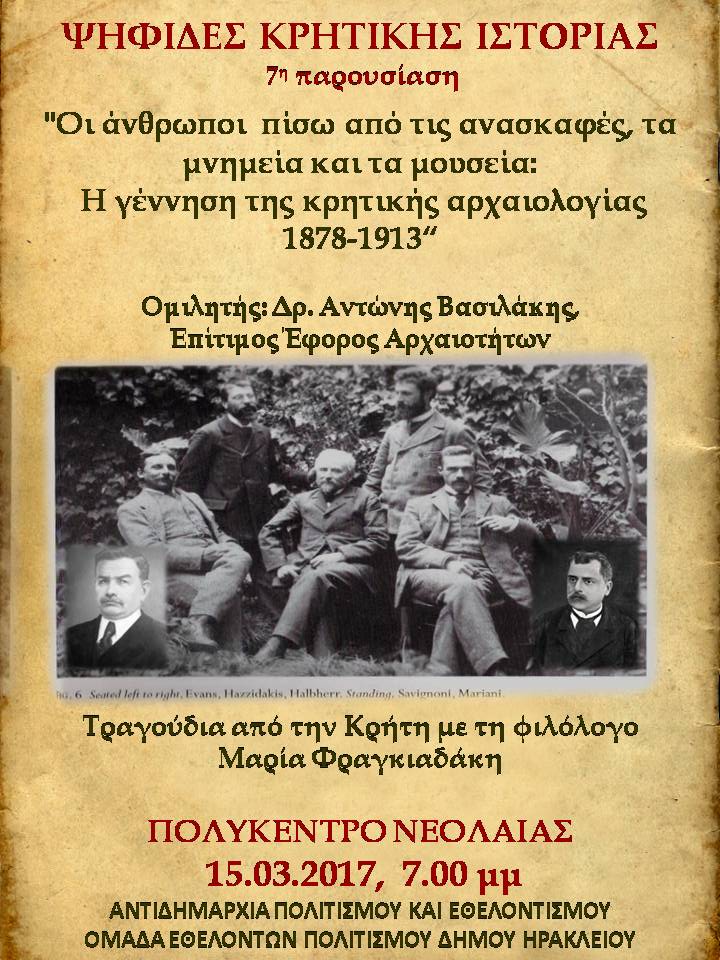 Η 7η παρουσίαση έχει θέμα: Οι άνθρωποι πίσω από τις ανασκαφές, τα μνημεία και τα μουσεία: Η γέννηση της κρητικής αρχαιολογίας 1878-1913“