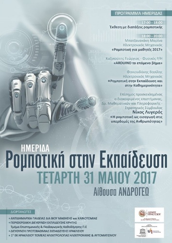 "Ρομποτική στην Εκπαίδευση" είναι το θέμα της ημερίδας που διοργανώνει η Αντιδημαρχία Παιδείας, Δια Βίου Μάθησης και Καινοτομίας του Δήμου Ηρακλείου και ο Τομέας Ηλεκτρολογίας Ηλεκτρονικής και Αυτοματισμού ΙΙ του 1ου ΕΚ Ηρακλείου σε συνεργασία με το Τμήμα Επιστημονικής και Παιδαγωγικής Καθοδήγησης Π.Ε και την Διεύθυνση Πρωτοβάθμιας Εκπαίδευσης Ηρακλείου. Η ημερίδα θα πραγματοποιηθεί στην αίθουσα «Μ. Καρέλλης» την Τετάρτη 31 Μαΐου από τις 18:00 έως τις 20:00.