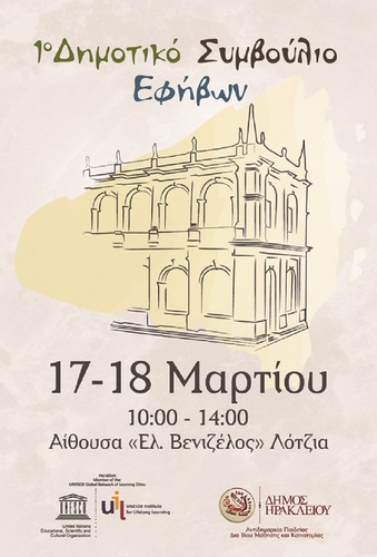 Συνεδριάζει το Πρώτο Δημοτικό Συμβούλιο Εφήβων στο Δημοτικό Κατάστημα Ηρακλείου (αιθ. Ελευθερίου Βενιζέλου) την Παρασκευή 17 Μαρτίου και Σάββατο 18 Μαρτίου και ώρα 10:00 π.μ. σύμφωνα με τις διατάξεις του άρθρου 67 του Ν. 3852/2010, προκειμένου να συζητήσει και να πάρει αποφάσεις στα παρακάτω θέματα: