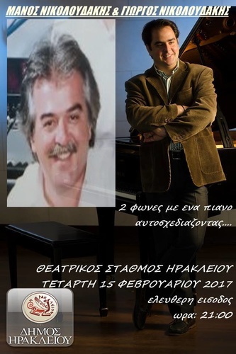 Συναυλία με 2 φωνές και ένα πιάνο και τίτλο «Αυτοσχεδιάζοντας» θα πραγματοποιηθεί την Τετάρτη 15 Φεβρουαρίου 2017 και ώρα 20:30 στο Θεατρικό Σταθμό Ηρακλείου με είσοδο ελεύθερη για το κοινό. Θα ερμηνευτούν τραγούδια που άφησαν ιστορία από Έλληνες και ξένους συνθέτες (Λεούσης, Ανδρέου, Μικρούτσικος, Σπανός, Πλέσσας, Χατζηνάσιος, Χατζιδάκις, Θεοδωράκης κ.α.) από τους Μάνο και Γιώργο Νικολουδάκη.