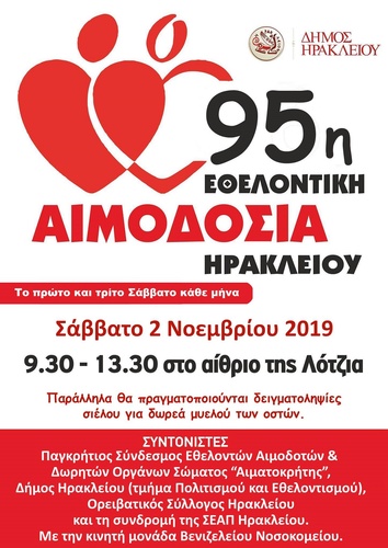 Εθελοντική Αιμοδοσία θα πραγματοποιηθεί το Σάββατο 02.11.2019 στο κέντρο της πόλης του Ηρακλείου (στο Αίθριο της Λότζια), και ώρες 09:30 – 13:30. Πρόκειται για μια κοινή προσπάθεια αιμοδοσίας, την οποία συντονίζουν: