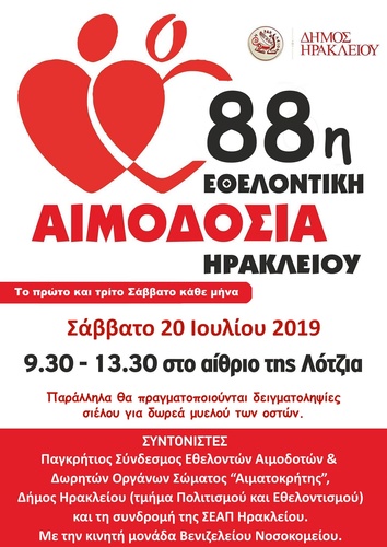 88η Εθελοντική Αιμοδοσία Ηρακλείου στο Αίθριο της Λότζια το Σάββατο 20/07/2019