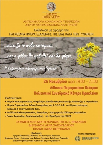 Εκδήλωση με στόχο την ενημέρωση και ευαισθητοποίηση της κοινωνίας για το φαινόμενο της έμφυλης βίας, θα πραγματοποιηθεί την Τρίτη 26 Νοεμβρίου και ώρα 19:00, στην αίθουσα του Πειραματικού Θεάτρου, του Πολιτιστικού Συνεδριακού Κέντρο Ηρακλείου. Την εκδήλωση διοργανώνει η Αντιδημαρχία Κοινωνικών Υπηρεσιών του Δήμου Ηρακλείου με την υποστήριξη της Περιφέρειας Κρήτης, με αφορμή την Παγκόσμια Ημέρα για την εξάλειψη της βίας κατά των γυναικών (25 Νοεμβρίου).