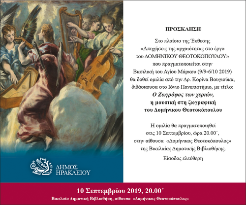 Στο πλαίσιο της Έκθεσης θα πραγματοποιηθούν δύο ομιλίες για τον Θεοτοκόπουλο. Η πρώτη θα λάβει χώρα σήμερα, Τρίτη 10 Σεπτεμβρίου, στη Βικελαία Δημοτική Βιβλιοθήκη, στις 20.00. Ομιλήτρια θα είναι η Δρ. Κορίνα Βουγιούκα, διδάσκουσα στο Ιόνιο Πανεπιστήμιο, με θέμα: «Ο Ζωγράφος των χεριών, η μουσική στη ζωγραφική του Δομήνικου Θεοτοκόπουλου».