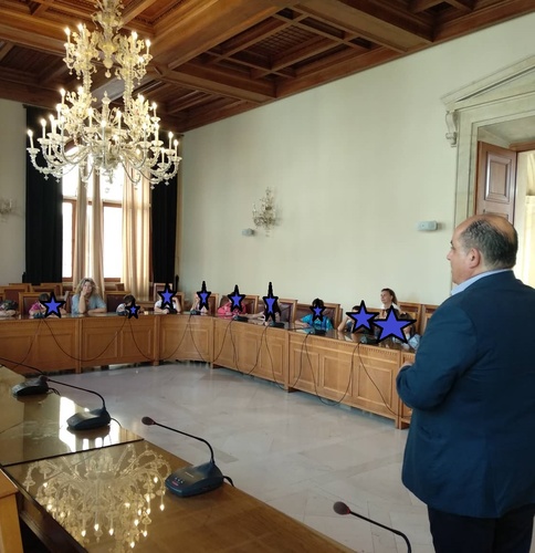 Οι μαθητές κάθισαν στα έδρανα της αίθουσας συνεδριάσεων του Δημοτικού Συμβουλίου «Ελ. Βενιζέλος» και παρακολούθησαν με μεγάλο ενδιαφέρον την ενημέρωση από τον Αντιδήμαρχο, τόσο για την λειτουργία του Δημοτικού Συμβουλίου, όσο και των υπολοίπων υπηρεσιών του Δήμου.
