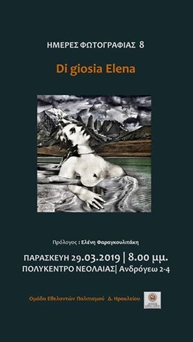 Το φωτογραφικό έργο της Elena Di giosia παρουσιάζεται, την Παρασκευή 29 Μαρτίου και ώρα 8.00 μ.μ. στο Πολύκεντρο Νεολαίας (Ανδρόγεω 2), σε εκδήλωση που οργανώνει η Ομάδα Εθελοντών Πολιτισμού του Δήμου Ηρακλείου υπό την αιγίδα της Αντιδημαρχίας Πολιτισμού-Εθελοντισμού και Μνημείων.