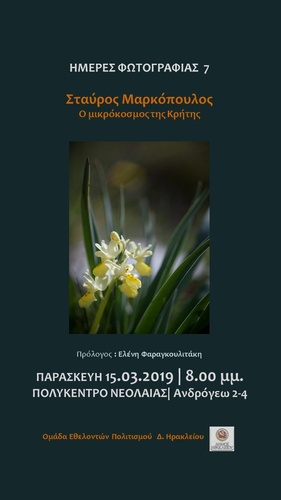 Το έργο τού ερασιτέχνη φωτογράφου Σταύρου Μαρκόπουλου παρουσιάζεται την Παρασκευή 15 Μαρτίου, και ώρα 7.30 μ.μ. στο Πολύκεντρο Νεολαίας του Δήμου Ηρακλείου (Ανδρόγεω 2). Η εκδήλωση περιλαμβάνεται στο πλαίσιο των «Ημερών Φωτογραφίας», που διοργανώνει η Ομάδα Εθελοντών Πολιτισμού του Δήμου υπό την αιγίδα της Αντιδημαρχίας Πολιτισμού-Εθελοντισμού, προκειμένου να αναδειχθεί το έργο καλλιτεχνών φωτογράφων της Κρήτης.