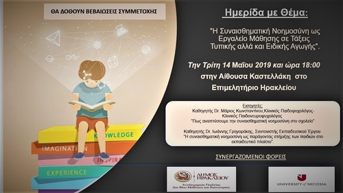 «H Συναισθηματική Νοημοσύνη ως Εργαλείο Μάθησης σε Τάξεις Τυπικής αλλά και Ειδικής Αγωγής» είναι το θέμα της ημερίδας που διοργανώνει ο Δήμος Ηράκλειου (Αντιδημαρχία Παιδείας, Δια Βίου Μάθησης και Καινοτομίας) και το Πανεπιστήμιο Λευκωσίας. Η ημερίδα θα πραγματοποιηθεί την Τρίτη 14 Μαΐου 2019 και ώρα 18:00 στην Αίθουσα «Καστελλάκη» στο Επιμελητήριο Ηρακλείου.