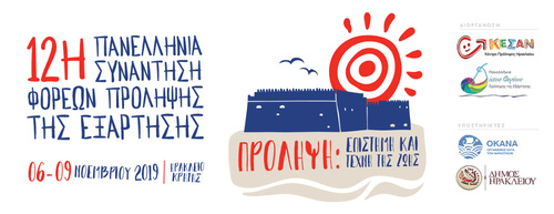 Η 12η Πανελλήνια Συνάντηση Φορέων Πρόληψης της Εξάρτησης με θέμα: «Πρόληψη: Επιστήμη και Τέχνη της Ζωής» θα πραγματοποιηθεί στο Ηράκλειο από την Τετάρτη 6 έως το Σάββατο 9 Νοεμβρίου 2019. Πρόκειται για μία Πανελλήνια Συνάντηση Φορέων Πρόληψης της Εξάρτησης, που πραγματοποιείται κάθε δύο χρόνια σε διαφορετική πόλη, όπου ανταλλάσσονται καλές πρακτικές, απόψεις, προβληματισμοί και εξελίξεις από το πεδίο της πρόληψης των εξαρτήσεων, με στόχο τη συνδιαμόρφωση του επόμενου εξελικτικού της επίπεδου, μέσα από διαδικασίες ανανέωσης, έμπνευσης, νέων οραμάτων, αλλά και παραγωγής επιστημονικού λόγου και γνώσης.