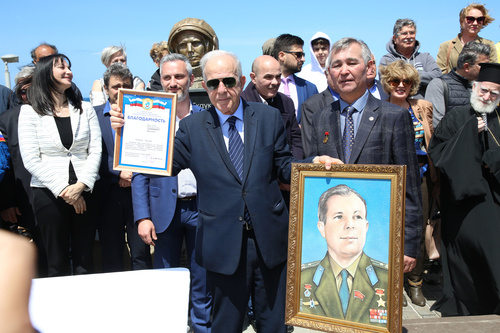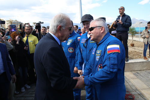 Στην σημερινή τελετή, μας τιμά, συνάμα, η παρουσία των εν ενεργεία Ρώσων κοσμοναυτών, οι οποίοι, σε μια συμβολική κίνηση, θα φυτέψουν στον χώρο αυτό μιαν ελιά.