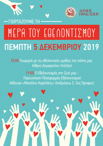 Με αφορμή την Παγκόσμια Ημέρα Εθελοντισμού (5 Δεκεμβρίου) ο Δήμος Ηρακλείου προσκαλεί τις εθελοντικές ομάδες που δραστηριοποιούνται τόσο στην πόλη όσο και στην περιφέρειά του, να ενημερώσουν τους δημότες για τις δράσεις τους.