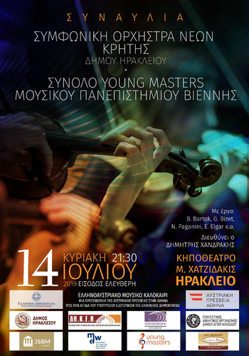 Ο Δήμος Ηρακλείου, η ΔΗΚΕΗ, ο Δήμος Αγίου Νικολάου και η Συμφωνική Ορχήστρα Νέων Κρήτης φιλοξενούν στο νησί το μουσικό έργο «Young Masters Program» που εκπονήθηκε από κοινού με το Πανεπιστήμιο Μουσικής και Παραστατικών Τεχνών της Βιέννης. Πρόκειται για σειρά εκδηλώσεων που εντάσσονται στο πλαίσιο του «Ελληνοαυστριακού Μουσικού Καλοκαιριού» που διοργανώνει για δεύτερη χρονιά η Αυστριακή Πρεσβεία υπό την αιγίδα του Ελληνικού Υπουργείου Εξωτερικών.