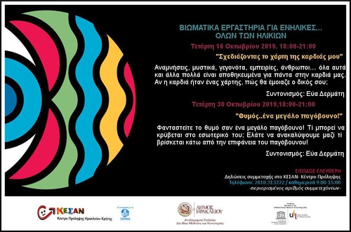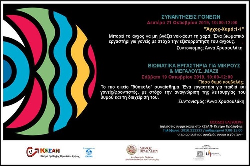 Βιωματικά εργαστήρια για μικρούς και μεγάλους μαζί, γονείς και ενήλικες διοργανώνει το μήνα Οκτώβριο 2019 το ΚΕΣΑΝ - Κέντρο Πρόληψης των Εξαρτήσεων και Προαγωγής της Ψυχοκοινωνικής Υγείας Δήμου Ηρακλείου, στο πλαίσιο του MOVERE: ένα πρόγραμμα για τα συναισθήματα για μικρούς και μεγάλους. Το MOVERE σχεδιάστηκε από την επιστημονική ομάδα του ΚΕΣΑΝ - Κέντρου Πρόληψης και υλοποιείται σε συνεργασία με την Αντιδημαρχία Παιδείας, Δια Βίου Μάθησης και Καινοτομίας Δήμου Ηρακλείου, στο πλαίσιο των δράσεων «Ηράκλειο: Η Πόλη που Μαθαίνει» του Παγκοσμίου Δικτύου της UNESCO.