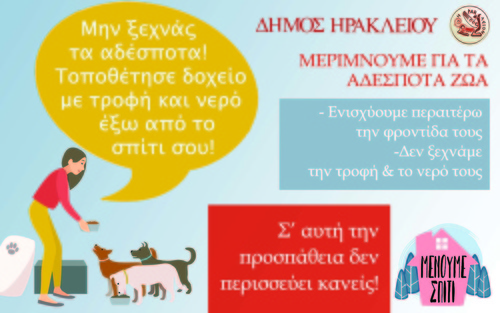 Έτσι ο Δήμος Ηρακλείου φρόντισε ήδη από την προηγούμενη εβδομάδα προκειμένου να τοποθετηθούν ποτίστρες και ταΐστρες για τα αδέσποτα σε πολλά σημεία της πόλης, προμηθεύτηκε τις απαιτούμενες τροφές ενώ καλεί και τους πολίτες- στο μέτρο του δυνατού και τηρώντας πάντα τα μέτρα ασφαλείας – να βάζουν τροφή και νερό στα ζωάκια που βρίσκονται στην περιοχή τους.