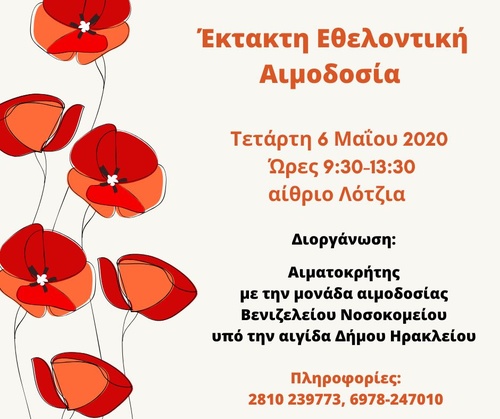 Έκτακτη εθελοντική αιμοδοσία θα πραγματοποιηθεί την Τετάρτη 06.05.2020 στο κέντρο της πόλης του Ηρακλείου (στο Αίθριο της Λότζια), και ώρες 09:30 – 13:30. Πρόκειται για μια κοινή προσπάθεια αιμοδοσίας, την οποία συντονίζουν: