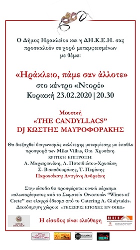 Αποκριάτικο πάρτι μεταμφιεσμένων με θέμα «Ηράκλειο, πάμε σαν άλλοτε», θα γίνει το βράδυ της Κυριακής 23 Φεβρουαρίου, αμέσως μετά την Καρναβαλική Παρέλαση, στις 20:30, στο κέντρο «Ντορέ».  Η «Καστρινή Αποκριά 2020» κάνει ένα …αφιέρωμα στα παλιά ιστορικά πάρτι της πόλης, με ελεύθερη είσοδο για όλους και με υποχρεωτική αμφίεση ή μάσκα. Εξαιρετικά κρασιά, εκλεκτοί μεζέδες, υπέροχη διακόσμηση και ένας σούπερ διαγωνισμός για την καλύτερη αμφίεση!