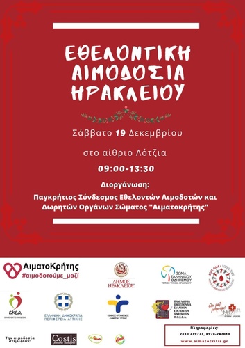 Εθελοντική Αιμοδοσία θα πραγματοποιηθεί το Σάββατο 19.12.2020 στο κέντρο της πόλης του Ηρακλείου (στο Αίθριο της Λότζια), από τις 09:00 έως τις 13:30. Πρόκειται για μια κοινή προσπάθεια αιμοδοσίας, την οποία συντονίζουν: