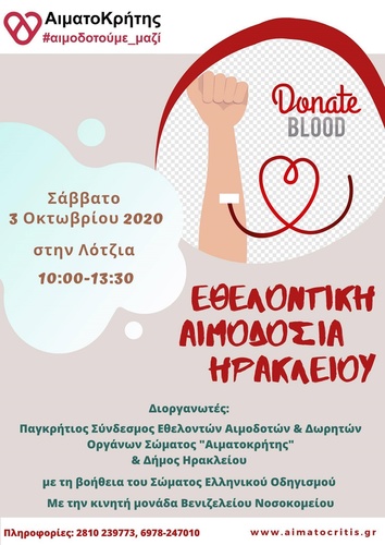 Εθελοντική Αιμοδοσία θα πραγματοποιηθεί το Σάββατο 03.10.2020 στο κέντρο της πόλης του Ηρακλείου (στο Αίθριο της Λότζια), από τις 10:00 έως τις 13:30. Πρόκειται για μια κοινή προσπάθεια αιμοδοσίας, την οποία συντονίζουν: