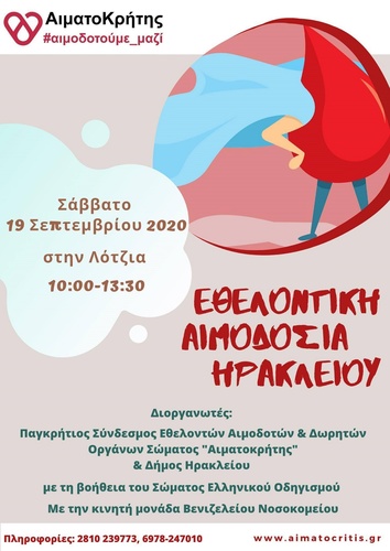 Εθελοντική Αιμοδοσία θα πραγματοποιηθεί το Σάββατο 19.09.2020 στο κέντρο της πόλης του Ηρακλείου (στο Αίθριο της Λότζια), από τις 10:00 έως τις 13:30. Πρόκειται για μια κοινή προσπάθεια αιμοδοσίας, την οποία συντονίζουν: