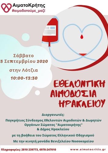 Εθελοντική Αιμοδοσία θα πραγματοποιηθεί το Σάββατο 05.09.2020 στο κέντρο της πόλης του Ηρακλείου (στο Αίθριο της Λότζια), από τις 10:00 έως τις 13:30. Πρόκειται για μια κοινή προσπάθεια αιμοδοσίας, την οποία συντονίζουν: