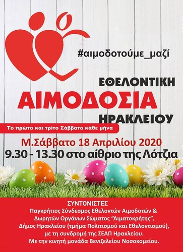 Εθελοντική Αιμοδοσία θα πραγματοποιηθεί το Μεγάλο Σάββατο 18.04.2020 στο κέντρο της πόλης του Ηρακλείου (στο Αίθριο της Λότζια), και ώρες 09:30 – 13:30. Πρόκειται για μια κοινή προσπάθεια αιμοδοσίας, την οποία συντονίζουν: