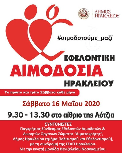 Εθελοντική Αιμοδοσία θα πραγματοποιηθεί το Σάββατο 16.05.2020 στο κέντρο της πόλης του Ηρακλείου (στο Αίθριο της Λότζια), και ώρες 09:30 – 13:30. Πρόκειται για μια κοινή προσπάθεια αιμοδοσίας, την οποία συντονίζουν: