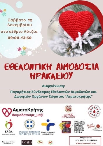 Εθελοντική Αιμοδοσία θα πραγματοποιηθεί το Σάββατο 12.12.2020 στο κέντρο της πόλης του Ηρακλείου (στο Αίθριο της Λότζια), από τις 09:00 έως τις 13:30. Πρόκειται για μια κοινή προσπάθεια αιμοδοσίας, την οποία συντονίζουν: