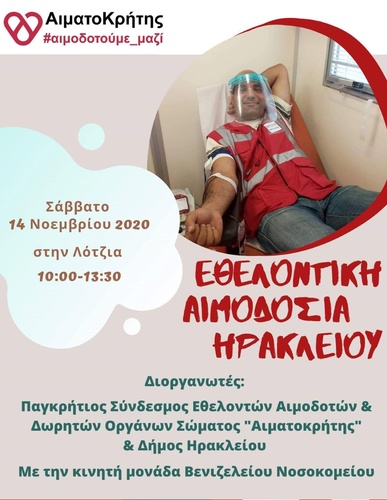 Εθελοντική Αιμοδοσία θα πραγματοποιηθεί το Σάββατο 14.11.2020 στο κέντρο της πόλης του Ηρακλείου (στο Αίθριο της Λότζια), από τις 10:00 έως τις 13:30. Πρόκειται για μια κοινή προσπάθεια αιμοδοσίας, την οποία συντονίζουν:
