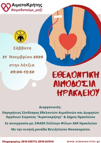 O Δήμος Ηρακλείου με την Αντιδημαρχία Πολιτισμού – Εθελοντισμού και ο Παγκρήτιος Σύνδεσμος Εθελοντών Αιμοδοτών και Δωρητών Οργάνων Σώματος «Αιματοκρήτης». Σε αυτή την αιμοδοσία συμμετέχει και ο Σύλλογος Φίλων ΑΕΚ Ηρακλείου (ΣΦΑΕΚ).